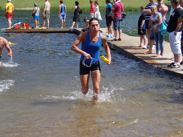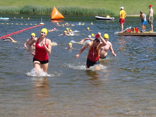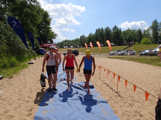 Jednak krok po kroku odebraliśmy pakiety startowe, oznaczyliśmy rowery i kaski i poszliśmy zapoznać się z wodą i strefą zmian (zostawia tam się rower na specjalnym stojaku) , jeszcze tylko objazd trasy rowerowej i nadeszła wielka chwila, wejście do wody , sygnał startera i poszły … Woda zagotowała się, było widać tylko kłębowisko młócących wodę rąk i żółte czepki zawodników i zawodniczek.